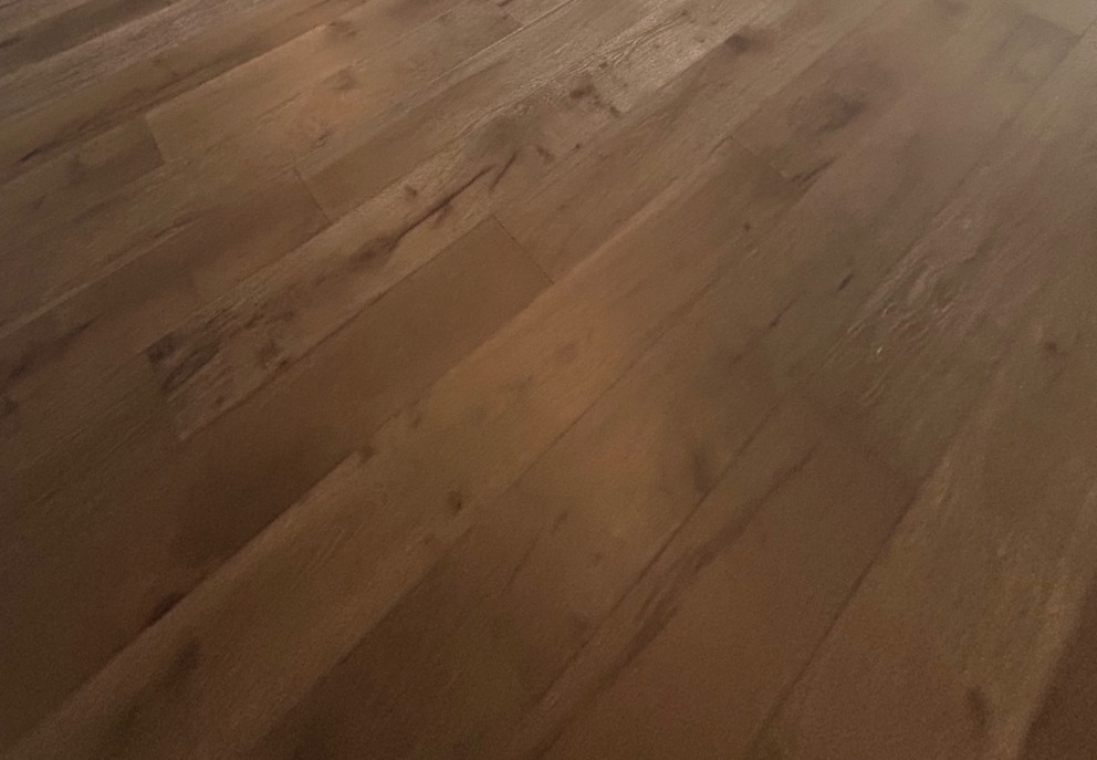 After installing the engineered hardwood Castlewood Oak flooring, our crew finished this installation job with shoe molding and 3 carpet tucks at the bedroom doorways.
